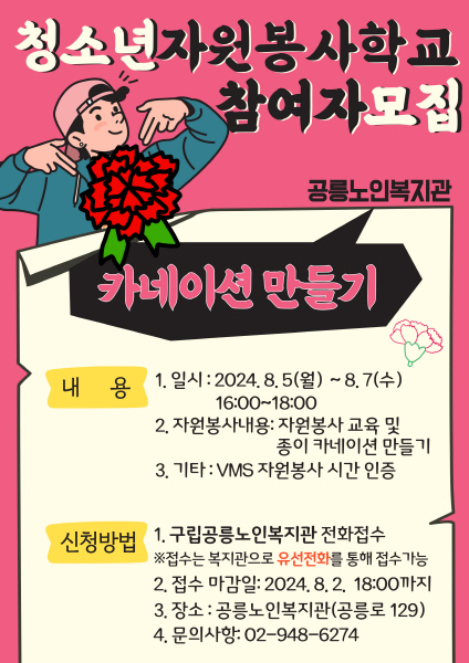 구립공릉노인복지관에서 여름방학을 맞이하여 청소년 자원봉사자를 모집합니다.