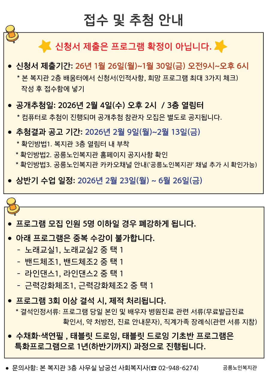 2026년 상반기 노년사회화교육 프로그램 시간표와 접수 일정, 신청 방법을 안내드립니다.
