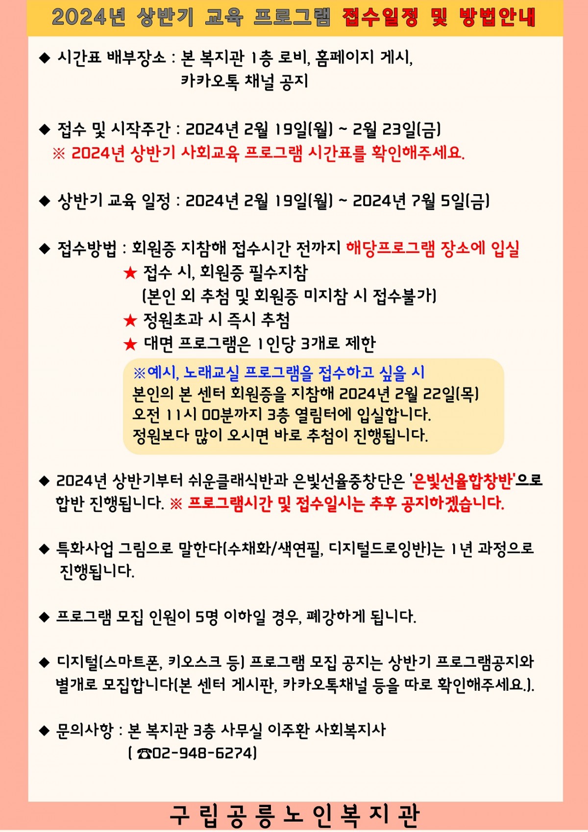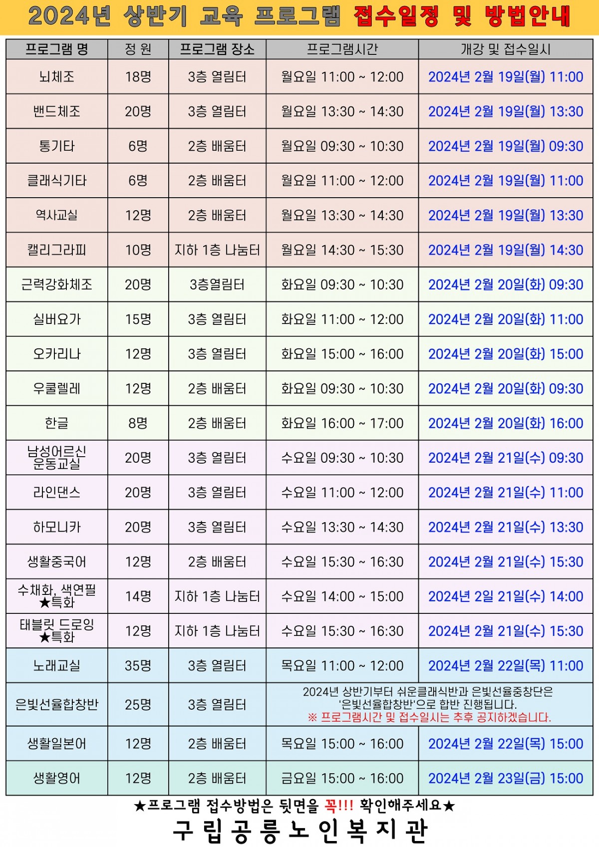 2024년 상반기 사회교육 프로그램 시간표 입니다. 작성자 admin 조회 592회 작성일 24-01-22 00:00 본문 2024년 상반기 사회교육 프로그램 시간표입니다.많은 이용 부탁드립니다. 목록 이전글사회복지사 1차 서류전형 합격자 발표 24.01.25 다음글(기간연장) 공릉노인복지관 사회복지사 채용공고 24.01.18